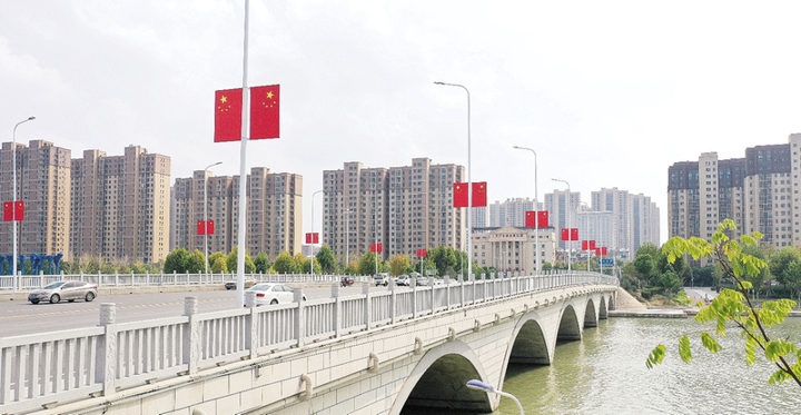 国庆节将至,城区北湖大桥等主要路段悬挂起一面面鲜艳的五星红旗,喜迎国庆节的到来,营造了浓厚的节日氛围。(天门市融媒体中心记者张俊摄)