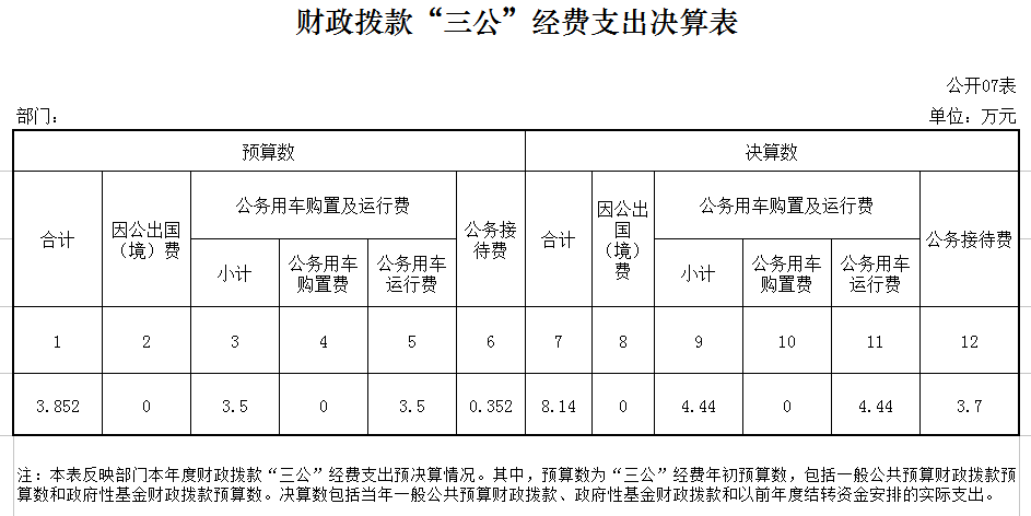 2018年度一般公共预算财政拨款“三公”经费决算数为8.14万元(含机关及所属基层预算单位),其中:因公出国(境)费0万元,公务用车购置及运行维护费4.44万元,公务接待费3.7万元。