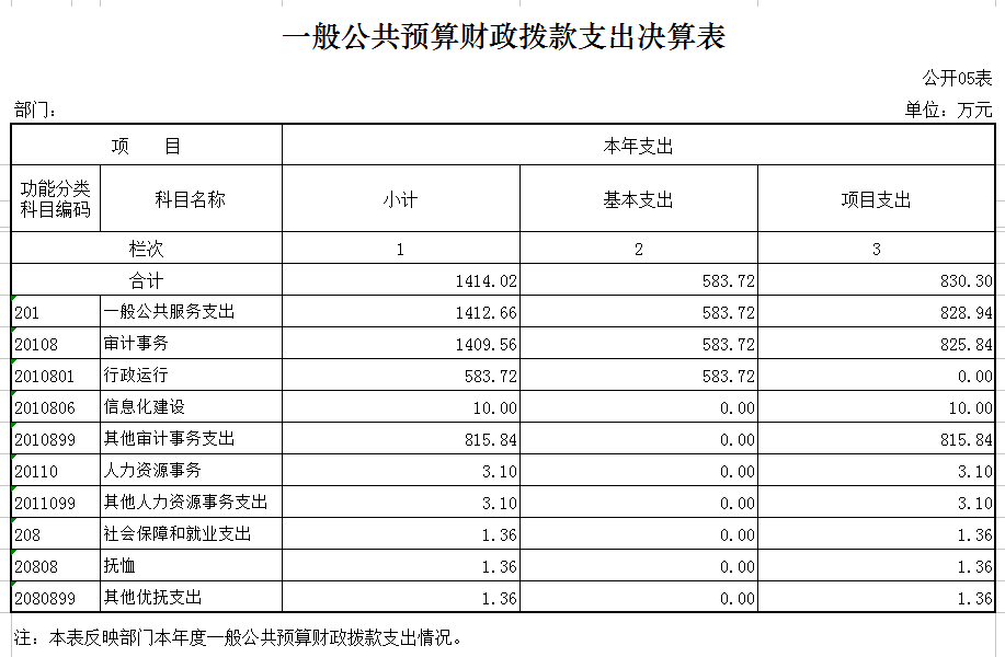 2018年度一般公共预算财政拨款支出决算为1414.02万元,其中:基本支出583.72万元,占本年支出合计的41.28%;项目支出830.3万元,占本年支出合计的59.72%。与上年相比,一般公共预算财政拨款支出增长379.01万元,增长36.62%。增减原因主要有审计事务项目支出增加。