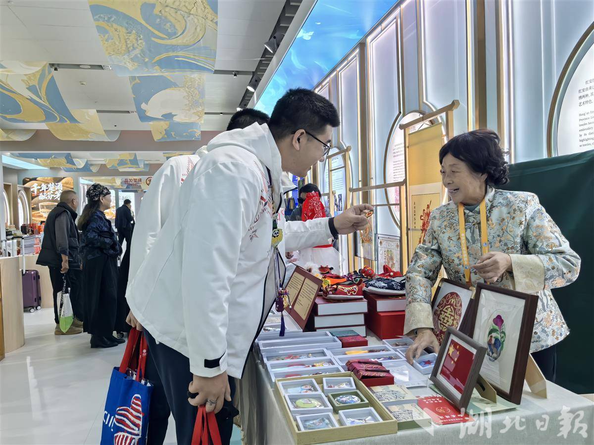 “红安绣活”非遗技艺传承人刘寿仙正在向观众介绍产品。(记者王艳华摄)