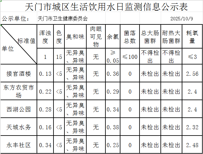 天门市城区生活饮用水日监测信息公示表(2025.10.9)