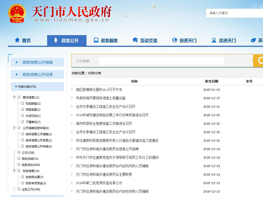 2018年,市住建委通过政府网站公开信息257条,其中机构职能2条,领导信息2条,内设机构1条,下属机构7条,公开指南目录年报3条,公文49条,规划总结12条,政务动态130条,财政信息3条,业务工作118条。通过《天门日报》刊登信息153篇,湖北建设信息网刊登339条,天门电视台播放信息5条。12月16日,我委副主任隆拥军参加天门网“在线访谈”就加快“四湖六河”建设 推进城市绿色发展与网友进行互动。按照市级政务公开工作要点分工方案,我委重点领域公开任务主要为重大建设项目批准和实施、公共资源配置和厕所革命相关工作,其中重大建设项目批准和实施主要为乡镇生活污水治理项目、东湖公园二期建设项目和“气化天门”工程,分别公开信息数量为8篇、2篇和3篇,公共资源配置我委主要涉及到农村危房改造,公开信息数量为6篇,厕所革命公开数量为3篇。