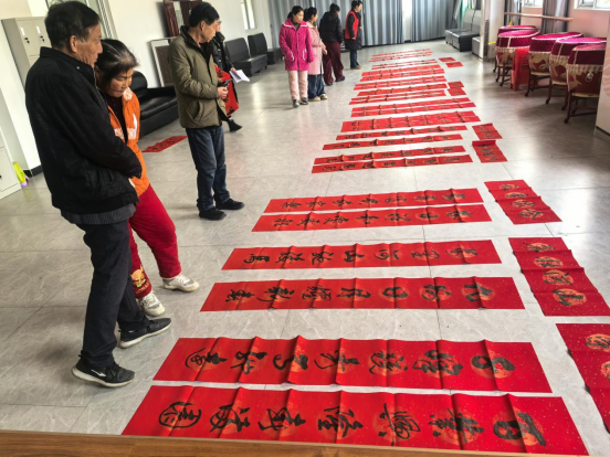 写好的春联与“福”字铺满现场,志愿者们细心协助整理、晾干,确保每份作品都能完好地送至居民手中。前来参与的群众络绎不绝,大家驻足欣赏、精心挑选心仪的对联与福字,笑容洋溢,暖意流动。“感谢文化站举办这么有意义的活动!”领取到春联的王女士喜悦地说道。